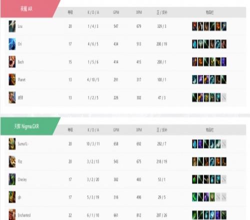 首局Sumail沙王依然强势中期带起节奏,Ori电魂连续被针对经济掉到第六团战毫无作用,AR虽然依靠Sumail一波莽撞冲锋打回一波,但是后续团战因为核心输出不足,拿沙王和酒仙没有办法!唯一的输出点Lou斯温倒下之后AR团战只有溃败!最终Nigma在中路+高地连续两波团战获胜,Bach獣买活死+Lou斯温阵亡!AR也不挣扎敲出了GG!