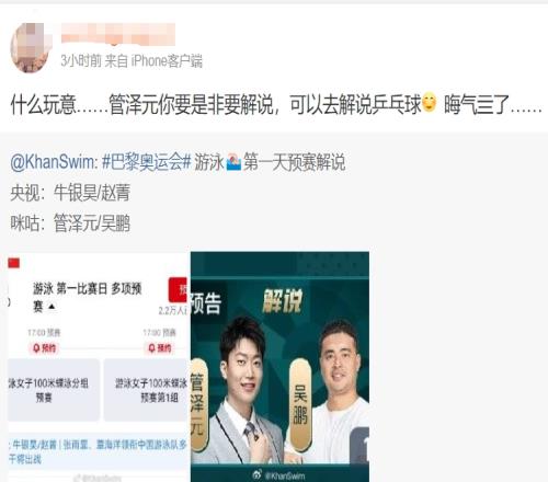 体育资讯7月27日报道宣称 今日巴黎奥运会游泳项目第一比赛日多项预赛,咪咕体育邀请管泽元、吴鹏解说,但是观众对于管泽元再度跨界骂声一片!