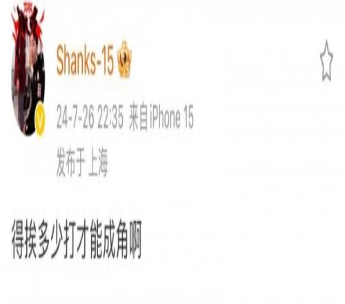 赛后,AL中单选手Shanks发文:“得挨多少打才能成角啊 ”