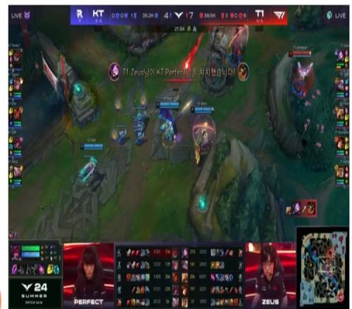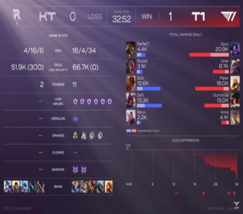 第一局前期Oner波比连续帮上,让Zeus的凯南十来分钟就压了对位的PerfecT鳄鱼40刀,对位经济2K的优势!KT的下路攻势也被Keria芮尔操作+Bdd岩雀内鬼大招阻止。T1连续拿龙埋下伏笔,关键的第三条小龙团,PerfecT鳄鱼单人绕后被抓,随后T1借助Keria芮尔吸两个+Gumayusi女枪哈哈哈+Zeus凯南开电的combo打出一波0换4大小龙全收,随后再收水龙魂+二大龙拉开一万经济差!最后的高地团T1再次打出芮尔+女枪配合,Zeus凯南开电留住剩余三人,T1一波0换5团灭KT,先拿一分!