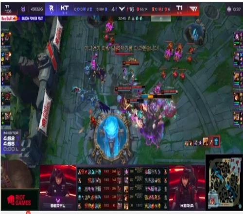 【32:25】T1两路分推,BeryL洛想闪现开团直接被Oner波比挡住!Keria芮尔再吸两个,Gumayusi女枪跟上哈哈哈直接秒人!Zeus凯南交闪开电留住剩余三人!Faker沙皇跟上一推解决战斗!T1一波0换5团灭KT,结束首局!