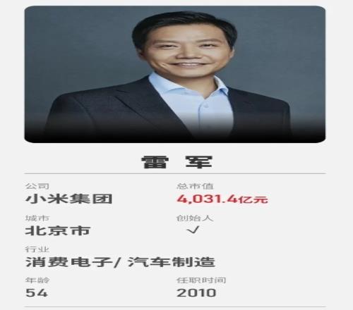 福布斯公布2024中国最佳CEO:小米雷军身价4031亿、网易丁磊4089亿