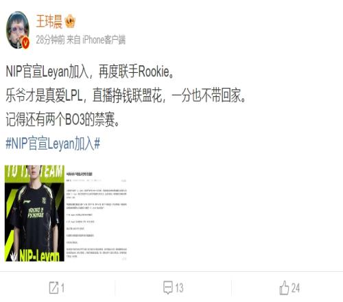 体育资讯7月22日报道宣称 今日NIP官宣Leyan加入,因此前不当言论被禁赛罚款,媒体人评价道: