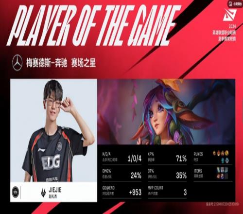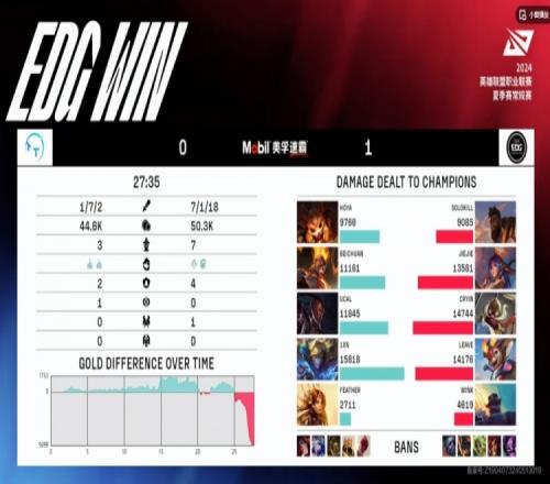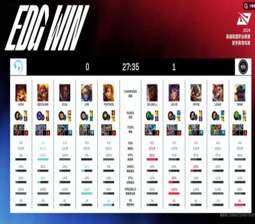 首局比赛HOYA纳尔上路对位压制,但是中路的UCAL卢锡安被Cryin库奇反压,EDG拿下了前期资源的优势!中期双方继续稳健运营,TT连续拿下两条风龙,但是24分钟的中路团战HOYA大纳尔闪现拍被Leave斯莫德闪现规避,EDG处理掉纳尔,打出TT多人残血,回头拿下大龙!最后的中路团Leave斯莫德被开有盾弓没倒,EDG一波0换4直接结束首局!
