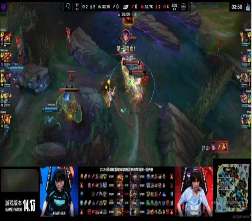【20:05】河道Feather曙光落单,Jiejie莉莉娅开睡留人配合队友拿下一血!随后Cryin库奇TP下路支援,HOYA纳尔闪现撞墙被EDG上中合力击杀,EDG两波打出0换2!