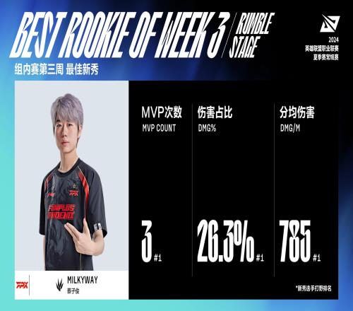 体育资讯7月22日报道宣称 LPL官方公布了第三周MVP选手及最佳新秀,TES下路选手JackeyLove获本周MVP选手,FPX打野选手milkway获得最佳新秀。