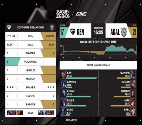 后期在Canyon率先阵亡的情况下,AL五打四被Ruler卡莎三杀,GEN团灭AL后吃掉大龙反超经济。但后续Flandre抢下关键大龙稳住局势,Kael野区再次钩中Canyon,Shanks发条拿下双杀。决胜团战,Kael再钩Canyon,王杰秒杀Ruler后击杀Kiin与Chovy拿下双杀,AL一波0换4直接推平GEN基地,双方进决胜局。