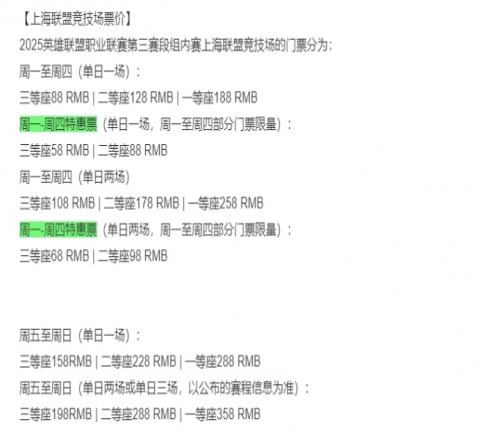2025英雄联盟职业联赛第三赛段组内赛上海联盟竞技场的门票分为: