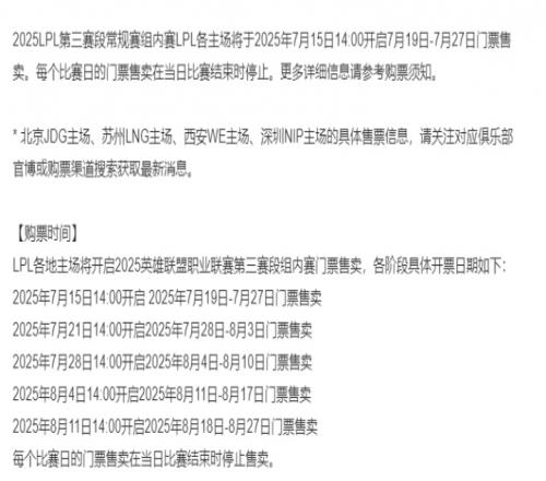 2025LPL第三赛段常规赛组内赛LPL各主场将于2025年7月15日14:00开启7月19日-7月27日门票售卖。每个比赛日的门票售卖在当日比赛结束时停止。更多详细信息请参考购票须知。