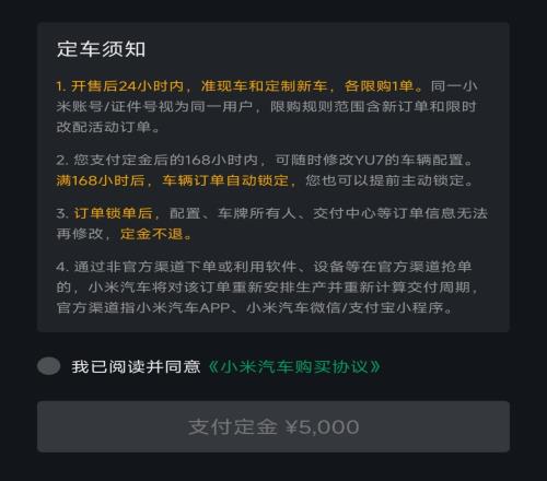 在“小米汽车”App订单须知中显示,锁单需要支付5000元定金,且定金无法退款。