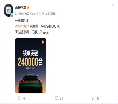 就在刚刚,小米汽车官方在社媒公布数据,YU7车型开售18小时,锁单量已突破240000台!