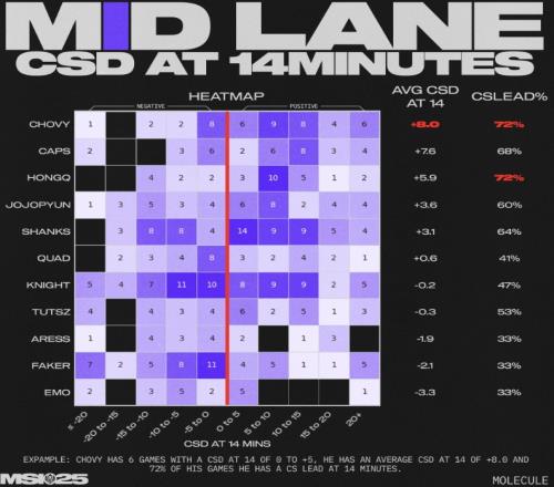 MSI中单14分钟补刀差热力图:Chovy场均领先8刀,领先率72%