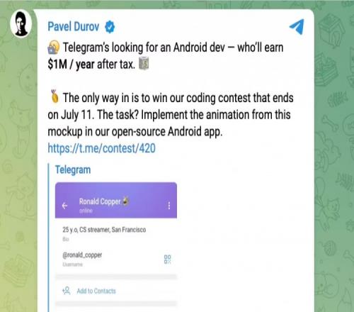 部分功能很好用Telegram首次公开“招人”寻安卓开发者称税后每年100万美元