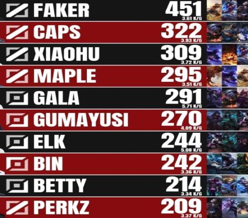 Faker 451、Caps 322、Xiaohu 309、Maple 295、GALA 291、Gumayusi 270、Elk 244、Bin 242、Betty 214、Perkz 209。