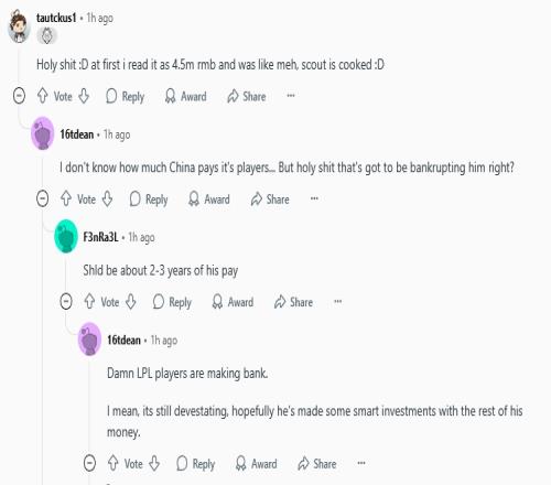 - OMG,LPL 选手是真的赚大钱啊;不过说真的,这(赔偿)还是挺致命的,希望他剩下的钱做了些明智的投资吧。