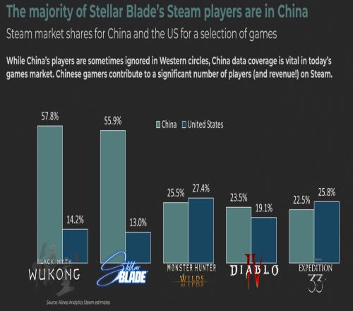 体育资讯6月21日报道宣称 《剑星》PC Steam版上线后,迅速在中国玩家中掀起热潮,大量涌入的中国用户再次证明了中国市场在全球游戏行业中不可撼动的地位。近日,国外分析机构Alinea Analytics对比了部分游戏中国和美国市场的占比,凸显了中国玩家的声音越来越不容忽视,中国玩家在全球游戏版图中的日益重要性。