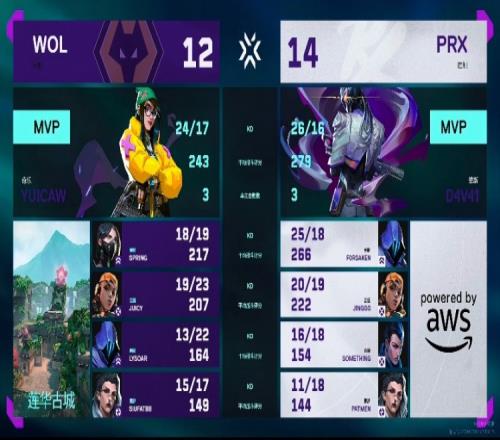 第二十六局:PRX开局进攻B点,狼队在点内打出2换3,后续PRX转到C点完成下包,狼队三人回防被PRX抓到机会先杀两人,后续面对1打2残局,狼队被PRX拿下!