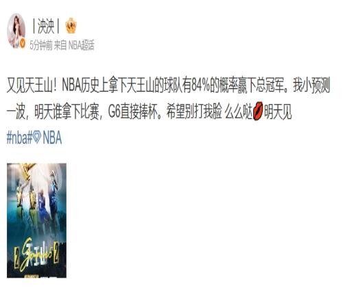 体育资讯6月16日报道宣称 明日NBA总决赛天王山就将打响,对此LPL女主持泱泱更博预测称:明天谁拿下比赛,G6直接捧杯!