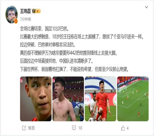 “18岁的王钰栋在场上太超模了,跟放了个亚马尔进来一样。拉边突破,巴林单对单根本没法防。