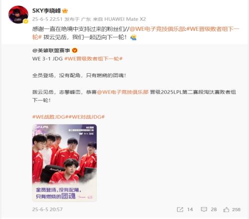 “人皇”Sky李晓峰祝贺WE淘汰JDG:感谢绝境中支持过来的粉丝们!
