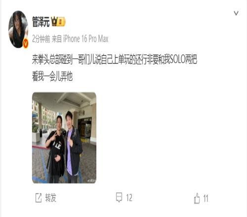 管泽元分享与Smeb合照:来拳头总部遇到一哥们,说他上单玩的还行