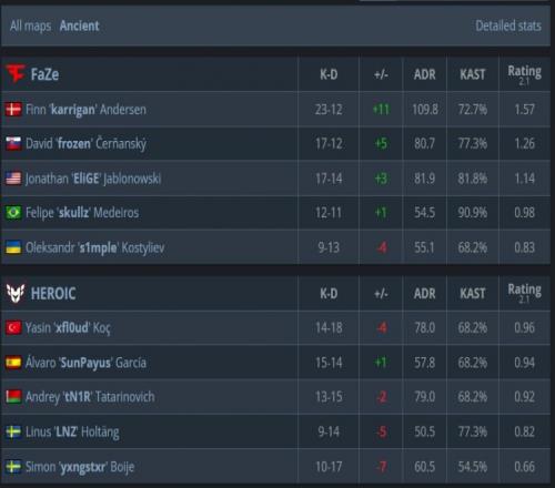 远古遗迹上半场Heroic先攻,残局大表哥甜甜圈双杀单局三杀,最后单挑SunPayus失手,X队拿到首分。次回合FaZe强起未果,开场S1mple睡着,Heroic连拿3分。第四局双方长枪局,A包点frozen与鸡哥瞬间被秒,FaZe三人保枪再送一分,而后FaZe暂停回来,S1mple大狙一发带走SunPayus吹响反攻号角,FaZe拿到首分。X队整体推进次回合稳住阵脚打A得手,随后大表哥与frozen发威让FaZe连追3分,X队回敬A点得手再次打出FaZe暂停。第11局,大表哥先带走LNZ,xfl0ud双杀后鸡哥回敬双杀,frozen连续两回合战至最后,FaZe以6-6结束上半场;