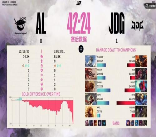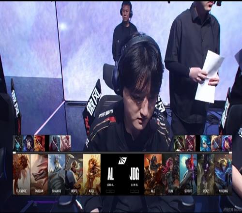 关键时候JDG也稳了下来,Scout永恩完美拉扯配合队友打出1换3之后再拿大龙,AL下路最后一波强开kael曙光吃不住伤害先倒,JDG冲锋高地,Xun蔚闪现锁头强杀Hope飞机!JDG集火减员AL,最终完成团灭之后结束首局的比赛!
