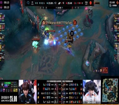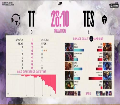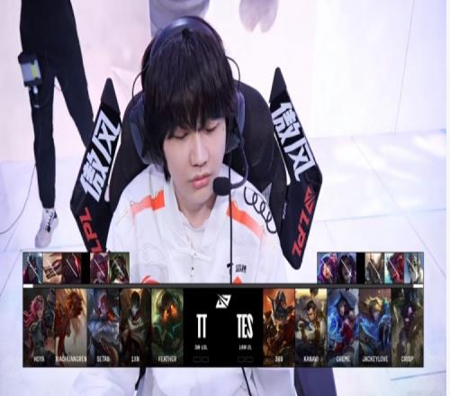 首局比赛TT下路对线优势,但是奇怪主动换线导致让JKL的EZ拿下一血,随后JKL的EZ上路越塔单杀1xn烬,Feather泰坦满血打断回城,结果自己直接被1/3血的EZ跟闪反杀!8分钟EZ就拿到3-0的开局!18分钟野区团战JKL的EZ连续三个Q命中,配合Kanavi的赵信收割了残局,自己也在拿下四杀之后早早超神!后续团战TT想动厄塔汗结果被Crisp牛头绕后直接击飞四个!这波TES再次打出0换4拉开经济差,随后的比赛TES不给机会,拿下大龙之后野区抓死SeTab岩雀,高地团再打一波0换2结束首局比赛!
