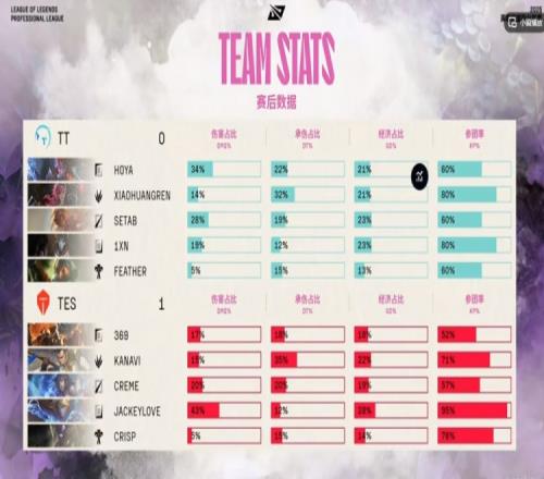 TES:上单369、打野Kanavi、中单Creme、下路JackeyLove、辅助Crisp