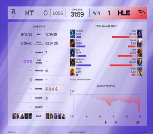 首局比赛HLE三路线优,又在下路一波4打2之后开打了局面!KT只能被动防守,HLE在17分钟拿下听牌龙之后一度领先超过了7K!但是随后HLE野区一波少打多被KT反打0换3,又在开打荆棘厄塔汗的时候被Cuzz猴子抢掉了荆棘厄塔汗,KT也将经济差打回到2K多!但是关键时刻HLE还是没掉链子,连续集火击杀做视野的Peter曙光之后拿下火龙魂+远古龙,4打5的KT又不去看,又不回城,结果直接在野区被HLE强开1换4结束!HLE先拿一分!