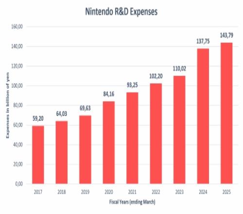 体育资讯5月11日报道宣称 今日据外媒Pierre485消息,任天堂在刚刚结束的财年,其研发费用达到了新的记录。