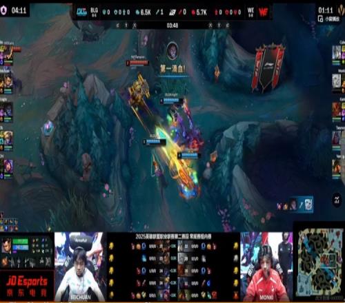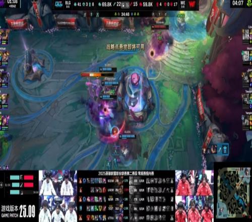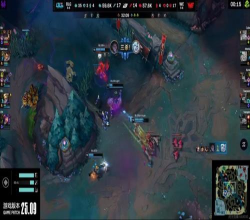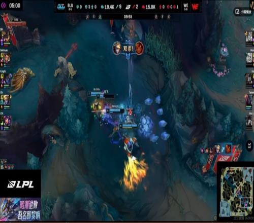 【9:50】WE强开Beichuan赵信,但是Bin兰博给大,ON妮蔻闪现坐大两个,丝血的赵信拉扯还没死!BLG正面打出0换3之后又直接蹲到了TP支援的Karis岩雀!Elk伊泽瑞尔再砍双杀!BLG再打一波0换4!经济差快4K了!