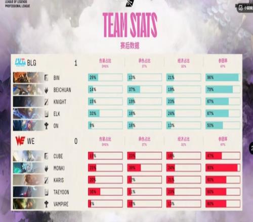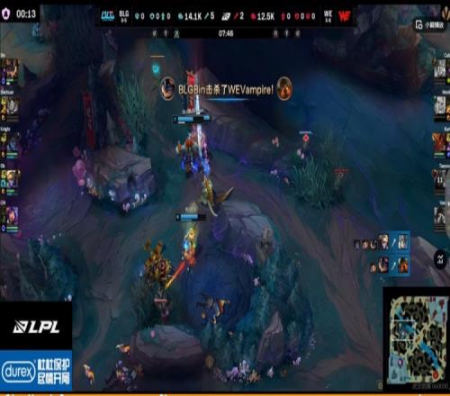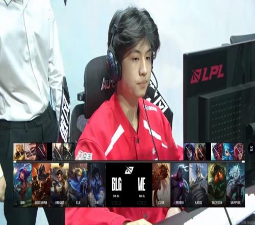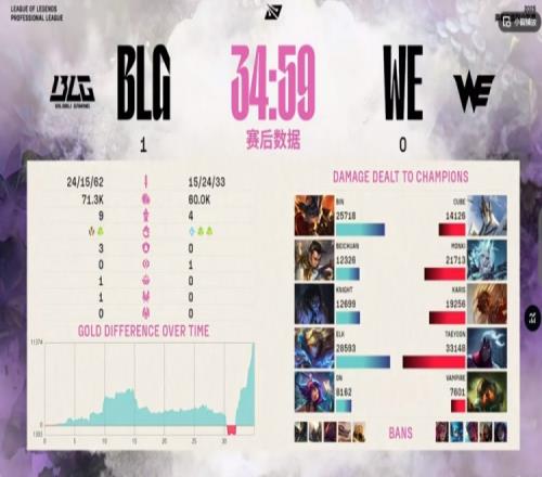 首局比赛BLG前期疯狂进攻,节奏不断,WE想接团越接越亏,10分钟BLG就拿下了快4K的经济优势,甚至打出了战略点!但是随后ON妮蔻带头,WE频繁抓单逮捕BLG落单的人,打回经济差还能控龙给压力!中期做视野的ON妮蔻连续被秒,WE一波回马枪打出0换3之后拆掉中路高地,经济反超!但是WE想一波又撤了埋了伏笔!BLG大劣势下大龙逼团,依靠几位明星选手拼操作打出完美团,0换5团灭WE拿下大龙再把局势打回!随后的龙魂团ON妮蔻先倒,但是knight塞拉斯偷到泰坦大配合队友秒掉了Monki佛耶戈之后趁势追击,BLG连续第二次团灭WE,从下路一波结束比赛!
