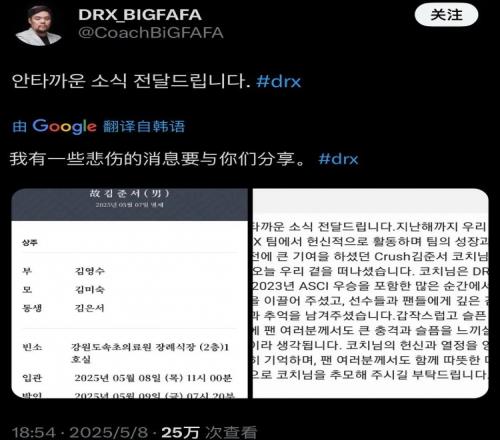 DRX:二队教练Crush离开了我们希望粉丝以温暖的心缅怀教练