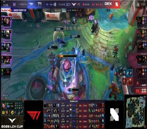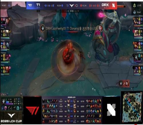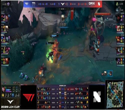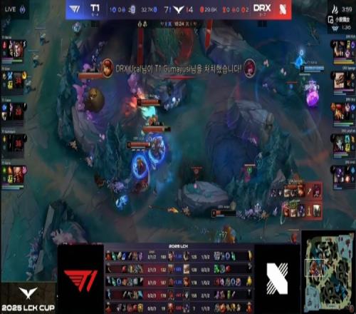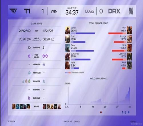 首局比赛T1前期稳健运营,但Doran杰斯在上路幽默白给了一把。中期T1首先拿下4K经济优势,但是Faker维克托河道落单被击杀,ucal安妮闪现R两个配合队友追击打出0换4之后打回一波!随后河道团Keria酒桶E闪R失误白给,又让DRX拿下一条小龙!27分钟中路Gumayusi霞落单被安妮E闪R秒了!DRX回头开大龙但是太痛了!T1的poke+追击打出3换4!随后一波野区团战DRX阵型稀碎,Rich兰博连续白给,T1拿下大龙之后不给机会,一波冲泉强杀Lazyfeel烬之后结束首局比赛!