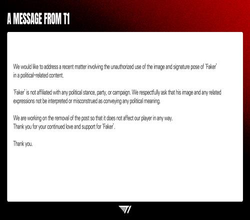"最近在部分政治相关的内容里发现了使用'Faker'选手的照片以及象征选手句子的事例,因而就此表明本公司的立场。