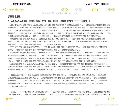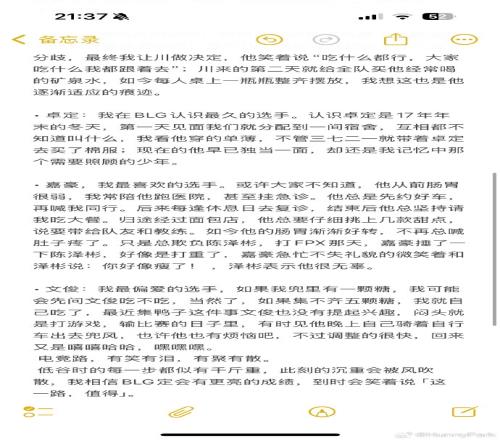 赛后BLG队内翻译在微博发布了长文,谈到了Beichuan加入队伍后和其他选手互相熟悉的过程。