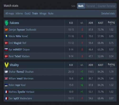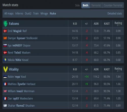 在与小蜜蜂对阵的五张地图中,Niko仅在图一小镇上拿到了14-11,1.01rating的正战绩,图二沙2 14-14,0.96raing,剩余三图均为负战绩(图三火车11-16,0.85rating;图四荒漠迷城21-26,1.01rating;图五nuke8-17,0.68rating)