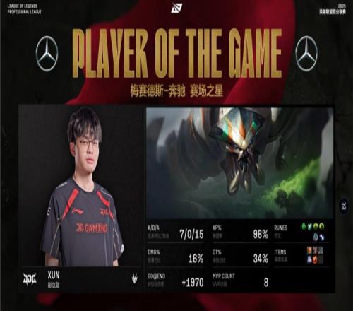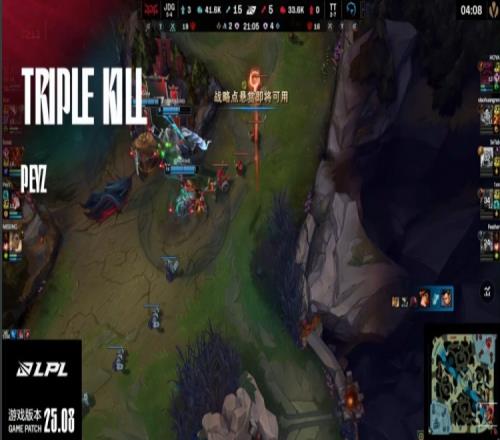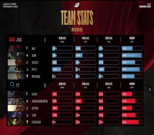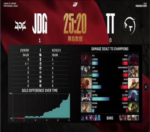 后期团战中,Scout岩雀封路精准,Peyz女枪持续收割,JDG多次打出0换3以上的团战优势,经济破万。最终JDG下路强推团灭TT,一波结束比赛,先下一城。