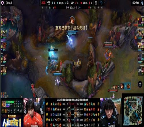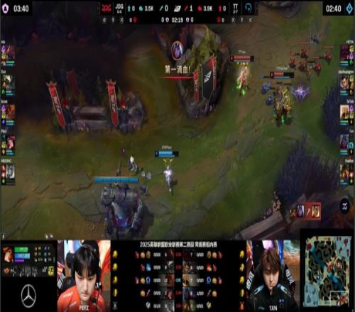 第一局前期JDG依靠下路2v2赢下对线,1xn韦鲁斯斩获一血。随后Scout岩雀节奏飞起,配合Xun连续击杀中野,JDG在前10分钟就打出0换2控下局势。