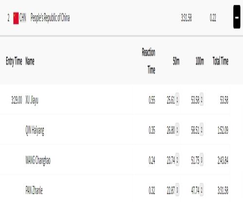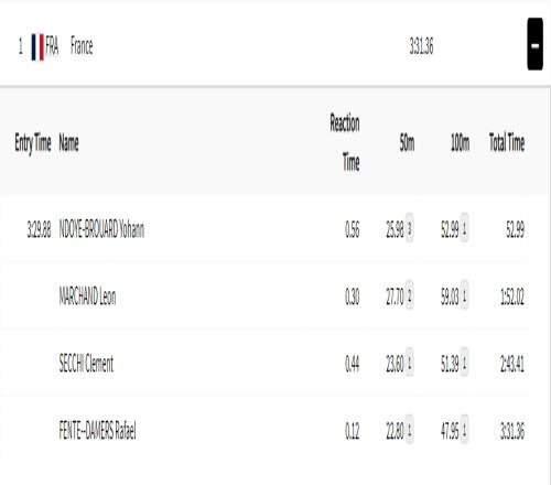 而之前在200米蛙泳破奥运记录夺冠的法国选手马尔尚,在接力中的分段成绩为59秒03。