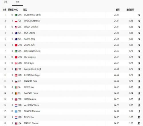 张雨霏被分在第8组出场,游出24秒54排在小组第2名,总成绩排在第6位晋级半决赛;吴卿风则在第10组出场,游出24秒57排在小组第3名,总成绩排在第8位晋级半决赛。