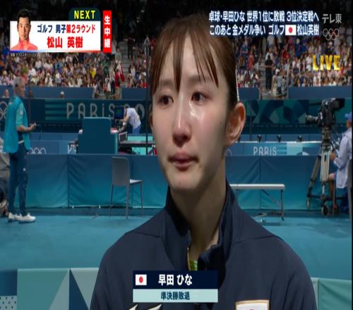 体育资讯08月02日报道宣称 巴黎奥运会乒乓球女子单打半决赛,中国选手孙颖莎4-0完胜日本选手早田希娜。赛后早田希娜接受采访时留下了泪水。
