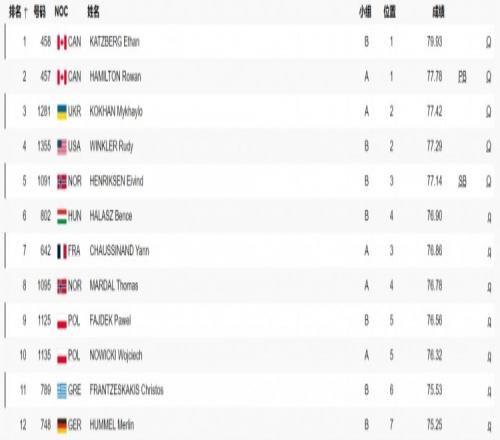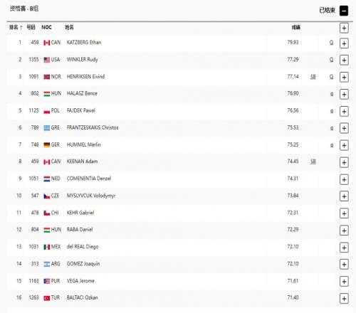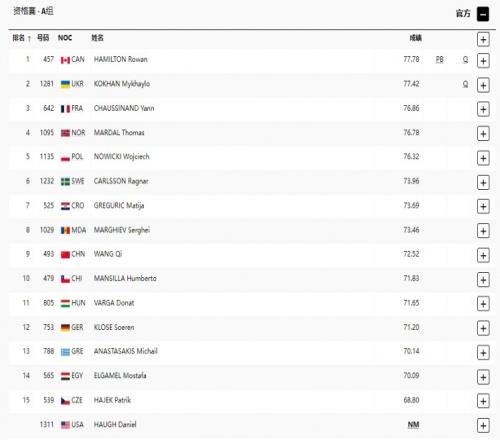 根据比赛规则,资格赛全部32人平均分为A、B两组,资格赛晋级标准线为77.00米,所有达到晋级标准(Q)或至少12位成绩最好的运动员(q)晋级决赛。