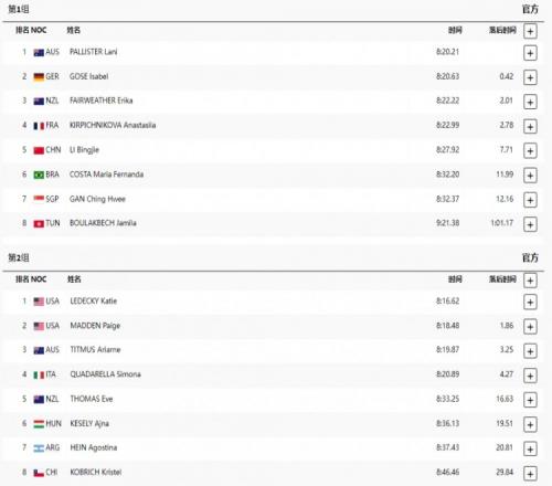 最终,排在第1组出场的李冰洁游出8分27秒92的成绩,排在小组第5位,总成绩排在第9位,无缘决赛。