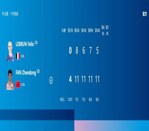 樊振东决赛的另一位选手将是巴西选手雨果和瑞典选手莫雷加德之间的胜者(双方的对决今晚八点半开打)。