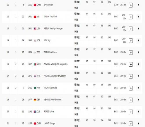 经过一系列角逐后,第一轮换的赵楠三轮分别打出95环、97环、99环,总成绩291环排在第11位;而第二轮换的梁小丫分别打出97环、98环、94环,总成绩289环排在第21位。