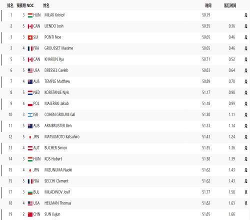 孙佳俊在第2个小组出场,最终游出51秒85排在本组第1。王长浩则在第3个小组出场,最终游出52.37排在本组第7。
