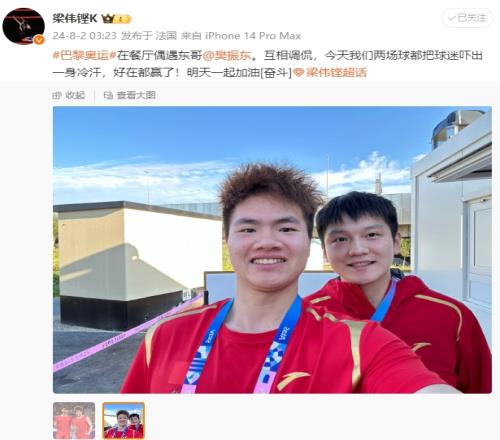 梁伟铿更新社媒晒出与樊振东的合影,并写道:“在餐厅偶遇东哥@樊振东。互相调侃,今天我们两场球都把球迷吓出一身冷汗,好在都赢了!明天一起加油。”