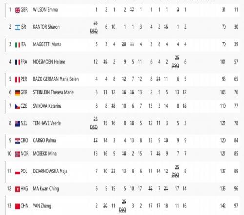 女子水翼帆板IQFOIL级中国选手闫铮排名第13